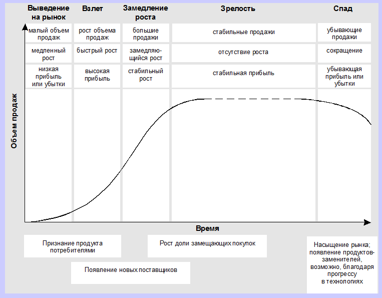 Свое влияние на спрос товаров оказывают также действия конкурентов и степень развития предлагаемых товаров и услуг. Последнее означает, что для прогнозирования спроса, требуется знать, на каком этапе жизненного цикла находится рассматриваемый продукт (товар или услуга). Типичные изменения спроса на товары на разных этапах показаны на рис. 1.12.
