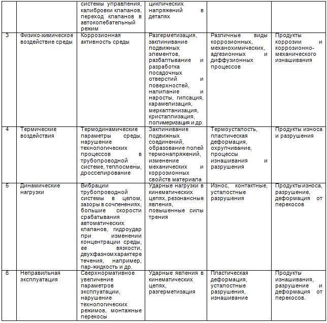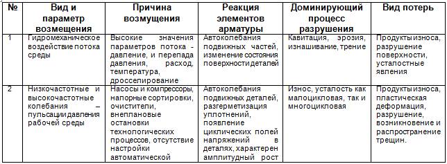 Возмущения – это те явления в структуре арматуры, которые приводят к ее деградации и потере работоспособности. Возмущения происходят как от внешних причин (коррозия, эрозия от движения потока, термические явления, теплосмены, гидромеханические, динамические процессы – пульсации, вибрации, ударные, распространяющиеся по трубопроводам), так и внутренних – например, переход к резонансным явлениям из-за неучета частоты собственных колебаний элементов и подсистем арматуры, собственная виброактивность клапанов, большие скорости соударения деталей затвора без демпфирования, большие зазоры в кинематических звеньях, передающих работу от привода к затвору – и возникновению значительных динамических нагрузок. Примеры характерных видов возмущений и вызванных ими потерь, встречающихся при эксплуатации арматуры приведены в табл.2.6.3.