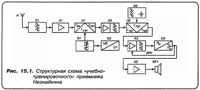 «А»: Придется, Незнайкин, придется… Итак, только вообрази себе, что сигнал интересующей тебя дальней радиостанции, который, как известно, распространяется в виде электромагнитной волны, навел на входе антенны приемника соответствующее высокочастотное напряжение Uc. При этом можешь смело считать, что оно не превышает, например, 50 микровольт. Естественно, что у тебя, в зависимости от выбранного диапазона, подключен или полосовой фильтр «1», или полосовой фильтр «2». Но ты что- то хочешь спросить?