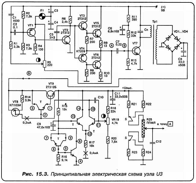 Заметь, нам требуется достаточно специфическое напряжение, равное +30 вольт. А у нас имеется напряжение — (+9 вольт). Вот в таких случаях и используют одну из разновидностей схем электронного статического преобразователя напряжения. Как видишь, ЗАДАЮЩИЙ ГЕНЕРАТОР (ЗГ) низкой частоты реализован на транзисторе VTI.