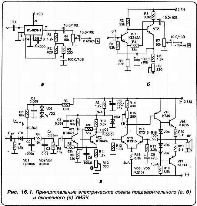 «А»: Именно схему двухкаскадного предварительного усилителя на транзисторах. Но не кажется ли тебе, что мы отвлеклись от нашего приемника, как такового?