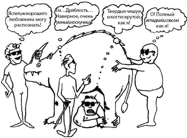 История о слепцах и динозавре в интерпретации Р. А. Уилсона. Иллюстрация из его книги «Прометей восставший» (в русском издании – «Психология будущего»).