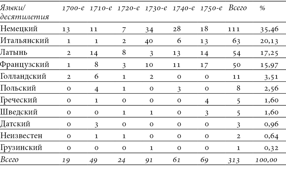 Если сравнивать число переводов с четырех языков, составляющих группу лидеров в первой половине XVIII века, – немецкого, итальянского, латыни и французского – то мы обнаружим, что количество переводов с немецкого значительно, примерно в два раза, превышало число переводов и с итальянского, и с латыни, и с французского, который начнет входить в силу только в 1750-е годы. Присутствие итальянского в этой группе лидеров объясняется не столько длительной традицией, как в случае латыни, сколько резким увеличением числа переводов с итальянского в 1733–1735 годах, что было связано с потребностями придворного театра Анны Иоанновны, ставившего значительное количество итальянских пьес 149 . Также нельзя не отметить, что за этот период не было, по-видимому, ни одного прямого перевода ни с английского, ни с испанского.