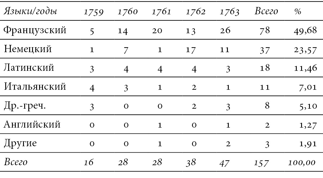 Получается, что в начале 1760-х годов французский заметно упрочил свои позиции, и произошло это в основном за счет латинского и итальянского языков, в то время как доля переводов с немецкого почти не поменялась.