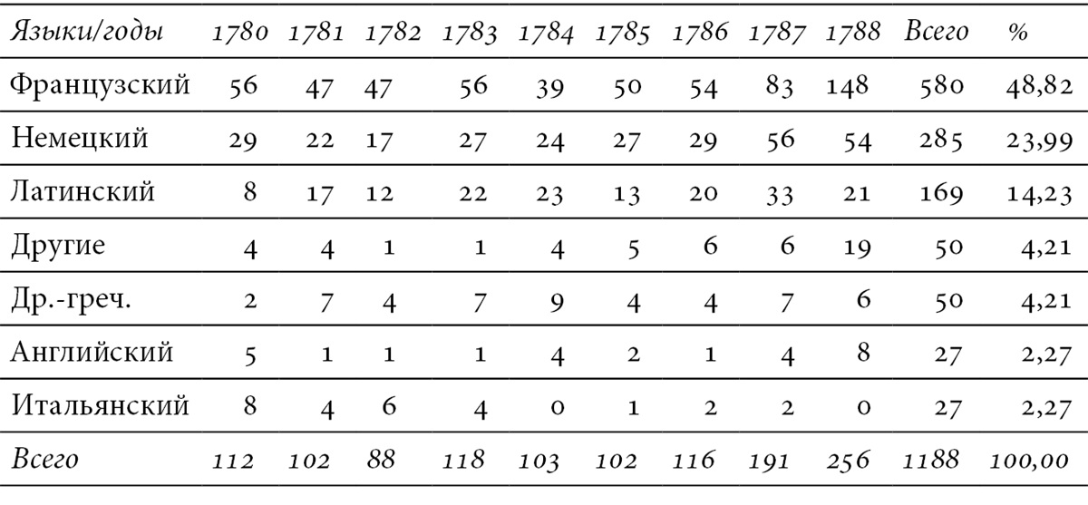 См. также подсчеты за период с 1756 по 1775 год в книге: Marker. Publishing, printing, and the Origins of Intellectual Life in Russia. P. 88. Они в целом согласуются с приводимыми нами цифрами, хотя доля книг, переведенных с французского, еще более значительна по данным Г. Маркера (52%), что отражает, очевидно, растущий интерес к французской книжной продукции, который по времени интересным образом совпадает с началом широкого распространения французского языка в русском обществе. Об этом см.: Offord D., Rj'eoutski V., Argent G. The French Language in Russia: a Social, Cultural, Political, and Literary History. Amsterdam, 2018.