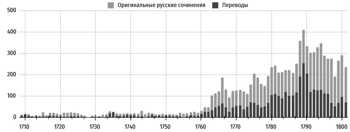 С началом революции во Франции и последовавшими за этим трудностями с доставкой печатной продукции в Россию, а также с введением цензуры количество переводных книг резко уменьшилось в 1789 и 1790 годах, возвратившись к уровню 1786 года. Интересно, что в 1790 году число оригинальных русских сочинений снова пошло вверх, причем довольно резко, и обогнало переводную литературу почти в два раза. Далее мы видим очередной упадок издательской деятельности начиная с 1795 года, что объясняется введением строгого цензурного контроля, в частности применением указа, подписанного Екатериной II 16 сентября 1796 года, незадолго до ее смерти, которым упразднялись частные типографии 144 .