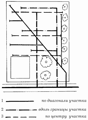 Перед тем как приступить к планированию садового участка, необходимо провести его осушение, иначе постройки могут быть разрушены подземными водами. Как правило, дренажные каналы располагают параллельно садовым дорожкам, а также поблизости от жилых и хозяйственных зданий, на расстоянии около 2 м. Следует иметь в виду, что дрены нельзя прокладывать рядом с корневой системой деревьев. Дренаж участка будет лучше, если под дорожками выложить подушки из песка и гравия. Размеры дрен (глубина, ширина) рассчитываются на основании глубины прохождения грунтовых вод, особенностей грунта, а также на основании природного рельефа. Основную дрену проводят по центру участка, по диагонали или вдоль границы (рис. 1).