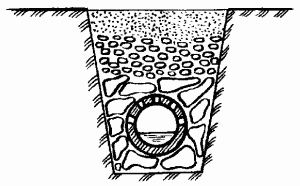 и бетона должны быть перфорированными. Основной дрен закладывают под уклоном 1: 40. К нему подводят боковые дрены, располагая их «елочкой» под углом 60°. Особенности почвы определяют расстояние между боковыми каналами: на глинистых почвах оно меньше, на песчаных больше. Рассчитано, что оптимальным расстоянием между боковыми трубами будет 4,5 м на глинистой почве, 7,5 м на суглинистой и супесчаной, 12 м на песчаной. Трубы располагают на дне траншей, предварительно покрыв его щебнем, плотно соединяют их между собой, засыпают щебнем, затем хворостом и сверху грунтом. Размер щебня не должен превышать 5 см, а хвороста – 5–8 см. Если засыпать трубы землей, могут забиться дренажные отверстия.Вместо труб на небольшом участке можно использовать доски, деревянные лотки с отверстиями и кирпичи, выложенные на расстоянии 2–4 см друг от друга.