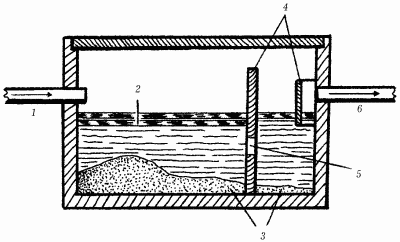 Рис. 3. Двухкамерное очистное сооружение: 1 – подводящая труба, 2 – плавающий слой, 3 – сапропель, 4 – разделительные перегородки, 5 – щелевые отверстия, 6 – выводная труба.