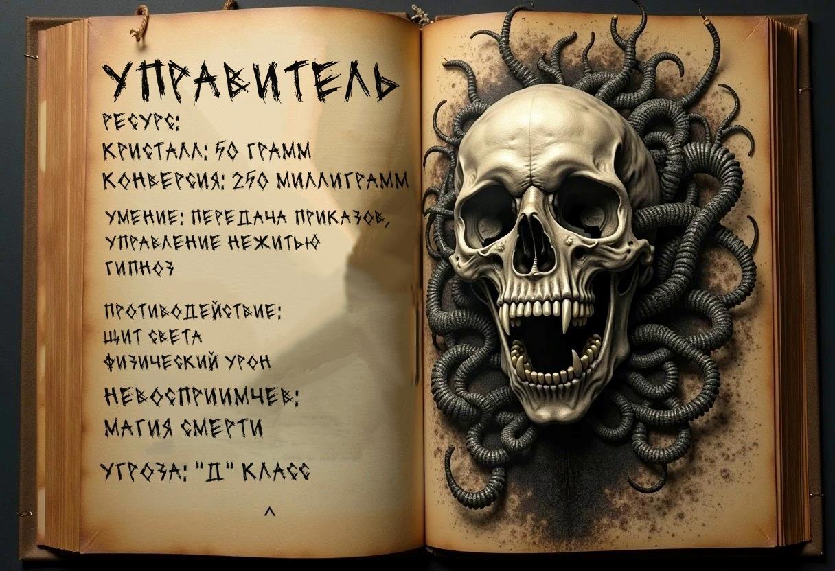 Обычный вечер вторника, он, как всегда, возвращался с работы, это было ровно год назад, но то, что он увидел, навсегда останется в памяти в виде шрама. Изуродованные тела его девочек, изнасилованная жена, повешенная на люстре больше ради забавы, с распоротым животом. Дочь с раскрытыми глазами, смотрящими на свою мать, и синяками по всему телу. Он бы посидел, будь у него такая возможность, но единственное, что ему оставалось, это пройтись по трупам. Сначала он спрятал изуродованные тела и принялся изучать запретную магию, отдавая все деньги и забираясь всё больше в кредиты, потом воскрешённые трупы коллекторов, поехавшая крыша, дочь, стоящая за спиной и просящая воскресить. Он и воскресил её, только при призыве произошла ошибка, душа спряталась так далеко, что удалось достать лишь кусочек. И теперь из-за этого она может обитать лишь в виде «Управителя», черепа на костяных ножках. Но в этом есть плюсы, любое тело ей доступно, как и разум с памятью бывшего носителя.