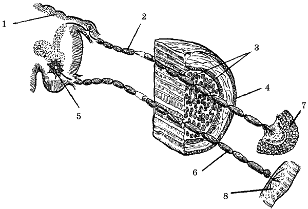 Строение нерва: 1 – спинной мозг; 2 – чувствительный нейрон; 3 – пучки нервных волокон; 4 – оболочка нерва; 5 – двигательный нейрон; 6 —миелиновая оболочка; 7 – кожа; 8 – мышцаДемиелинизационный процесс поражает преимущественно белое вещество центральной нервной системы. Поврежденный участок нейрона может подвергаться и ремиелинизации. Вслед за распадом миелина повреждаются и аксоны (рис. 2) с последующим развитием характерной глиозной бляшки.