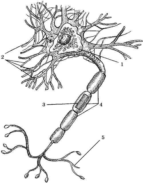 Рис. 2. Строение нейрона: 1 – тело; 2 – дендрит; 3 – миелиновая оболочка; 4 – аксоны; 5 – окончание аксона