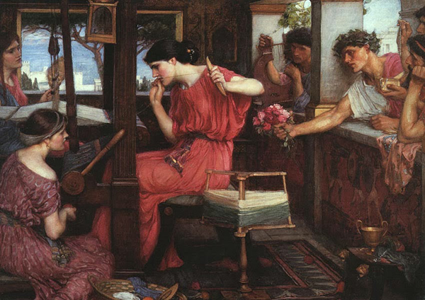 Так разговаривала со странником Пенелопа, не по дозревая, что говорит с Одиссеем. Но было уже поздно. Хотя Пенелопа готова была всю ночь напролет говорить со странником, все же пора ей было идти на покой. Встала она и пошла в свой покой со всеми рабынями, и там погрузила ее в сладкий сон богиня Афина.