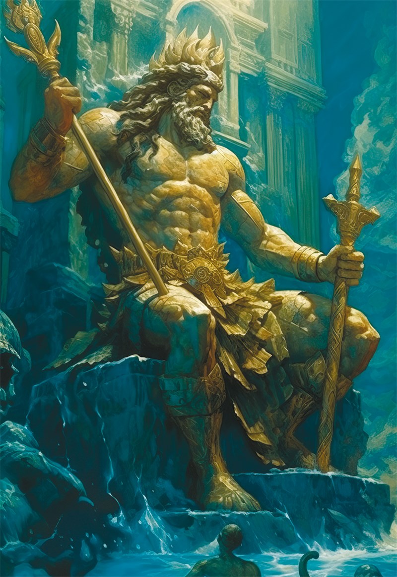 Посейдон властвует над морем. Когда он на своей колеснице, запряженной дивными конями, мчится по морю, расступаются вечно шумящие волны. Равный красотой самому Зевсу, быстро несется Посейдон по безбрежному морю, а вокруг него играют дельфины, рыбы выплывают из морской глубины и теснятся вокруг его колесницы. Когда же взмахнет Посейдон своим грозным трезубцем, тогда словно горы вздымаются морские волны, покрытые белыми гребнями пены, и бушует на море свирепая буря. Бьются с шумом морские валы о прибрежные скалы и колеблют землю. Но простирает Посейдон свой трезубец над волнами – и они успокаиваются.