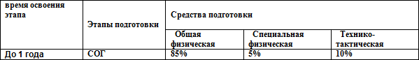 Таблица № 2 Соотношение средств физической и технико-тактической подготовки по годамобучения (%)