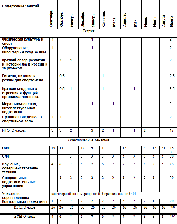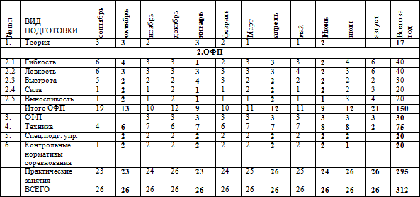 Примечание: октябрь, январь, апрель — увеличение количества часов за счет каникул.* Примечание: спец. подготовительные упражнения предусматривают упражнения на укрепление суставов, связок, мышц и сухожилий.