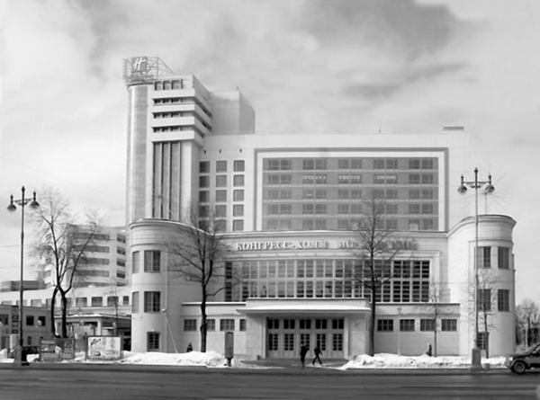 Здание состояло из трех корпусов. Главный вход расположен в южном четырехэтажном корпусе и оформлен темными колоннами. Сам корпус украшали угловые балконы и «псевдоленточные» окна. К нему примыкал малый зал на 500 мест, стена которого была оформлена большим горизонтальным витражом. Расположенная рядом винтовая лестница заключена в стеклянный цилиндр, в котором «парит» винтовая лестница.