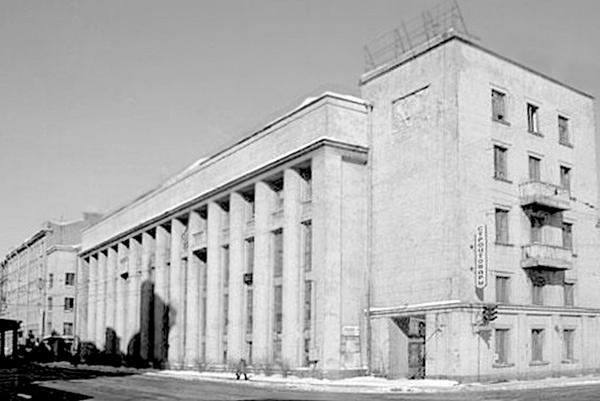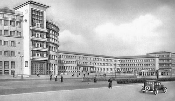 Здание на Московской площади построено в 1936–1941 годах группой архитекторов под руководством академика H.A. Троцкого — Я.Н. Лукиным, М.А. Шепилевским и др.