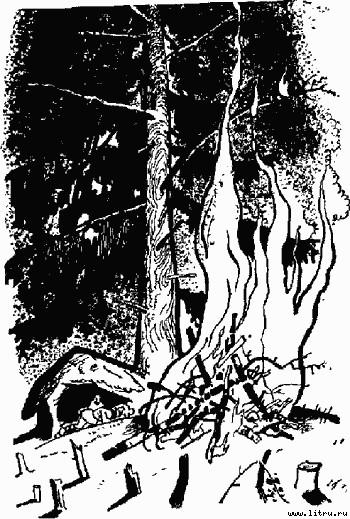 Уцелела одна старая ель с дуплом, в котором жила старая Белка с своей семьей. Под этой елью рабочие устроили себе балаган и спали в нем. Целые дни перед балаганом горел громадный костер, лизавший широким, огненным языком нижние ветки развесистого дерева. Зеленая хвоя делалась красной, тлела, а потом оставались одни обгоревшие сучья, топорщившиеся, как пальцы. Старая Белка была возмущена до глубины души этим варварством и громко говорила: