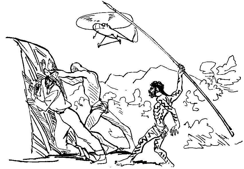 Сверкая на солнце лопастями винтов, вертолет сначала повис над поляной, потом стал медленно снижаться. И в этот момент пестрые полезли в ковчег. Машадо даже не заметил, когда возле широкой щели осталось всего три фигуры. Двое — высокие серокожие и рядом один маленький — пестрый. Пестрый поглядел на Машадо, что-то резко крикнул и ткнул одного серого копьем. Тот проворно попятился и полез в щель. Потом тупое копье уткнулось в грудь Машадо, оттесняя его к корме. Машадо не сопротивлялся. Здесь, возле ковчега, он выполнял то, что ему приказывали, как механизм. Что-то парализовало волю и оставило в нем единственное желание — держаться рядом с удивительным кораблем, не уходить от него… Он покорно подошел к корме, встал рядом с серым и навалился на пористую, покрытую темными потеками стенку. И вот стена дрогнула, отодвинулась, Машадо вынужден был переступить, чтобы не упасть. Он не удивился тому, что они вдвоем с серым сдвинули эту громадину. Он не удивился бы сейчас ничему…