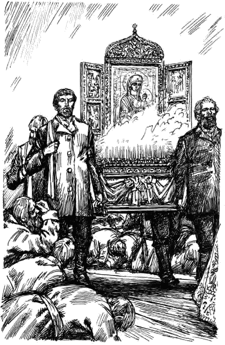 Несут по рабочим спальням. Для легкого воздуха накурено можжухой. Спаситель и Николай Угодник провожают. Вносят и в наши комнаты, выносят во двор и снова возносят на подмостки. Приходят с улицы – приложиться. Поют народом: «Пресвятая Богоро-дице, спаси на-ас!» Горкин руками водит, чтобы складнее пели. Батюшки кушают чай в парадном зале, закусывают семгой и белорыбицей, со свежими, паровыми огурцами. Василь Василич угощает в конторе «ящичного» и кучера с мальчишкой; мальчишку – стоя. Народ стережет священную карету. На ее дверцах написаны царские короны, золотые. Старушки крестятся на Ее карету, на лошадей; кроткие у Ней лошадки, совсем святые.