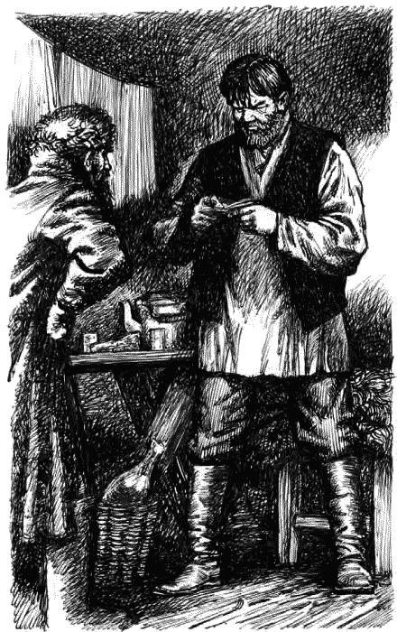 Входим в сторожку. Железная печка полыхает с гулом, от жара дышать нечем. За столиком из досок на козлах сидит пламенно-красный Василь Василич, в розовой рубахе, в расстегнутой жилетке; жирные его волосы нависли, закрыли лоб, а мутный некосой глаз смотрит на нас в упор. Перед печкой, на куче щепок и чурбаков, впривалку сидит Денис, тоже в одной рубахе, и пробует гармонью. На столике – закопченный чайник, – «ишь, бархатный у меня чайничек!» – бывало, хвалил Денис, – пупырчатые зеленые стаканчики, куски пирога с морковью, обглоданная селедка, печеная горелая картошка и грязная горка соли. А под столиком, в корзинке-колыбельке, – четвертная бутыль зелена вина.
