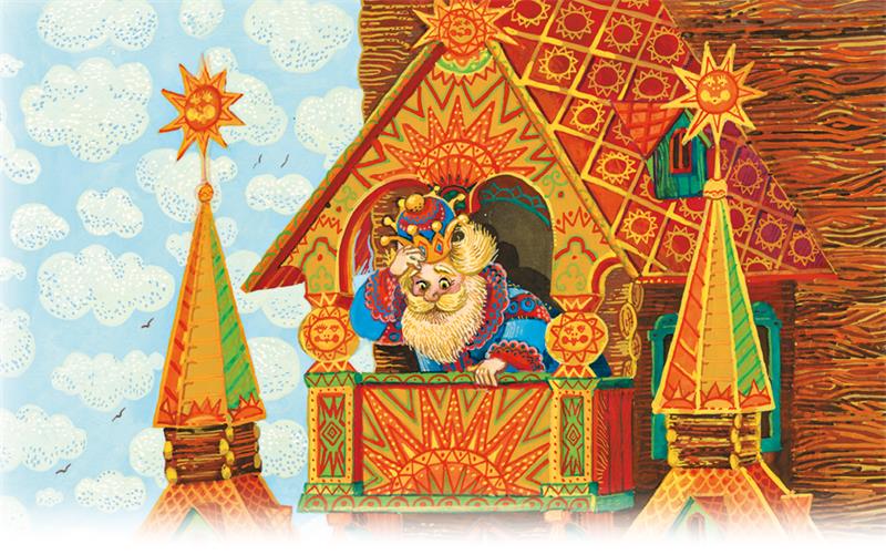 Царь на ту пору за обедом сидел: увидал летучий корабль, удивился и послал своего слугу спросить: кто на том корабле прилетел? Слуга подошёл к кораблю, видит, что на нем всё мужики, не стал и спрашивать, а, воротясь назад в покои, донёс царю, что на корабле нет ни одного пана, а всё чёрные люди. Царь рассудил, что отдавать свою дочь за простого мужика не приходится, и стал думать, как бы от такого зятя избавиться. Вот и придумал: «Стану я ему задавать разные трудные задачи». Тотчас посылает к дурню с приказом, чтобы он достал ему, пока царский обед покончится, целющей и живущей воды.