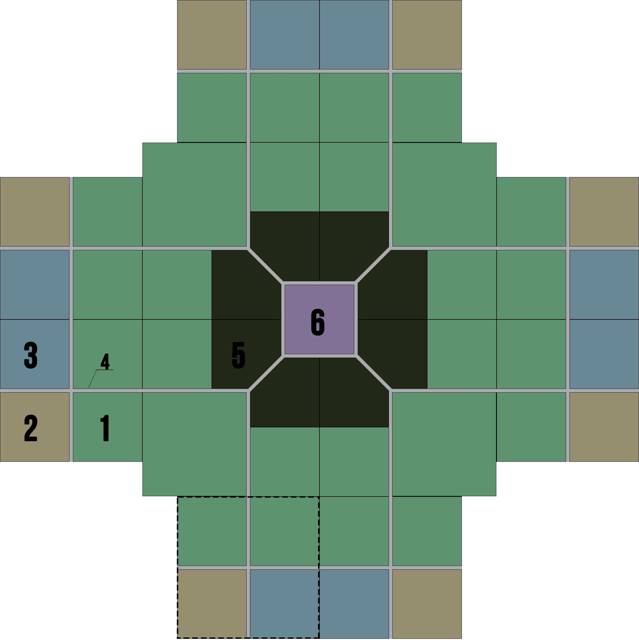 (Планируемая схема города, в перспективе один из жилых районов. 1.- жилой микрорайон, 2.- промышленный микрорайон, 3.- коммерческий микрорайон, 4.- магистральные дороги, 5.- зона центрального лесопарка, 6. — административный центр города/района. Пунктиром выделены заложенные на данный момент кубы)