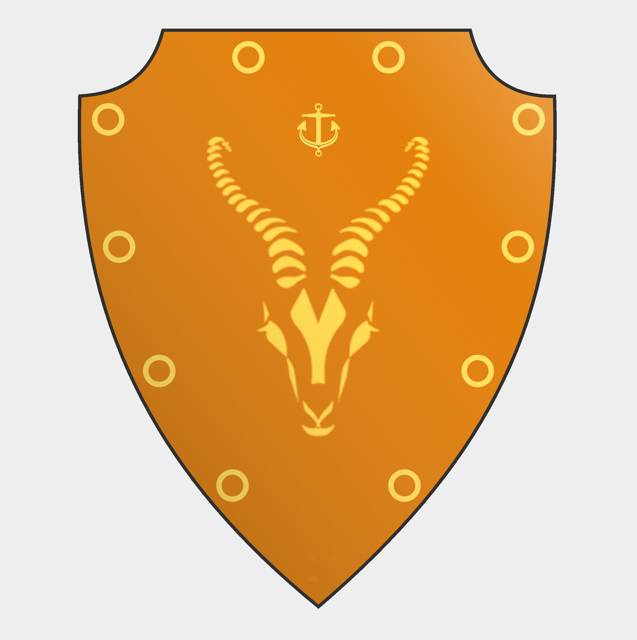 «Те люди… на поясе у них весело по фальшиону, а на спинах был прикреплен темно-желтый щит с некоторыми характерными символами на нем. Первым символом вроде бы по центру была голова оленя, лани или чего-то подобного. Вокруг по периметру были размещены толи символы похожие на кольца, толи на обручи, а над головой животного висел якорь, и все это было более светлого желтого оттенка, можно сказать даже золотого. Да, вроде как-то так…»