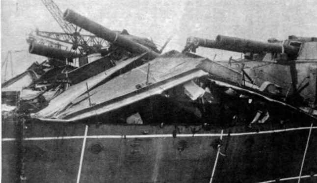 Линейный корабль "Монарх" в качестве экспериментальной морской мишени. 343-мм орудийные башни "А" и "В" после обстрела тяжелыми снарядами: 343-мм орудия башни "А" силой взрыва от прямого попадания снаряда выдавлены из башни броневой палубной обшивкой.