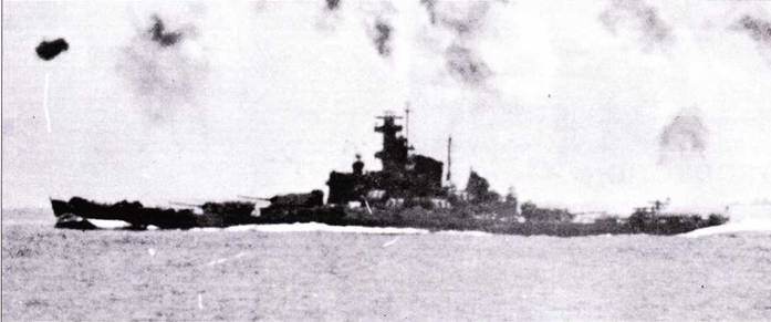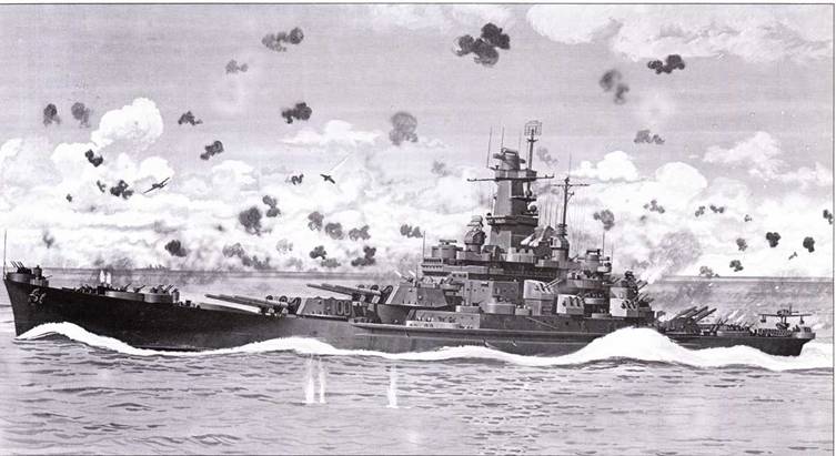 Разворот на полном ходу. «Южная Дакота» окуталась дымом от своих зениток, ведущих огонь по японским самолетам. 26 октября 1942 г. зенитчики линкора за один день сбили 26 японских аэропланов. Корабль окрашен по схеме Ms. 22.