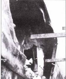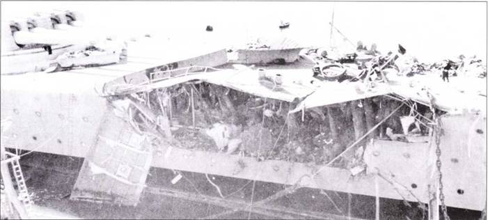 «Жан Бар», общий план и повреждения, причиненные снарядами «Массачусетса». Только одна из двух четырехорудийных башен главного калибра (15 дюймов) была выведена из строя снарядами «Массачусетса», но этого оказалось вполне достаточным. Повреждения корпуса наглядно демонстрируют мощь 16-дюймовых снарядов американского линкора.