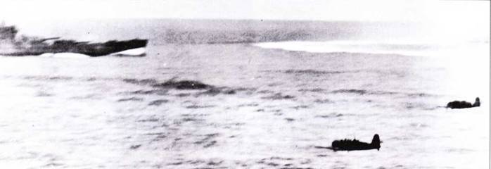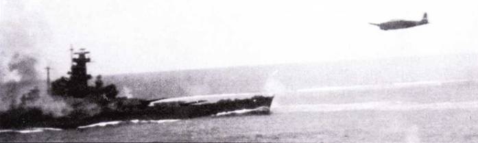 Пара палубных торпедоносцев Дзуйкаку «Кэйт» (Накаяма B2N2 тип 97 модель 12) атакует линкор «Южная Дакота», бой при Санта-Круз. Один торпедоносец сумел благополучно выйти из атаки, но другой пал жертвой зенитчиков «Южной Дакоты». Обе сброшенные самолетами торпеды прошли мимо линкора.