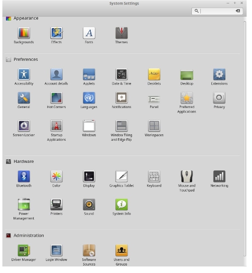 настроить все аспекты рабочей среды Cinnamon и компьютера вообще. Позже мы
