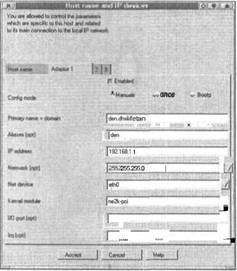 Нажмите на кнопку «Настройка сети» (или выполните команду netconf — кому как нравится). Далее в окне Network configurator щелкните по кнопке «Basic host information» и в открывшемся окне введите имя машины, а затем на вкладке Adaptor1 (см. рис. 7.3) активизируйте адаптер (Enabled). После этого введите информацию о своей сети и о своей плате (IP-адрес, сетевую маску, 10 Port, Irq). В поле NetDevice укажите тип сетевого устройства — пусть будет eth0 (от Ethernet), а в поле KernelModule — имя модуля ядра, которое соответствует вашему сетевому адаптеру (например, модуль ne2k-pci соответствует плате NE2000 PCI).