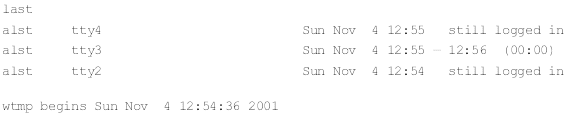Команда last выводит список последних зарегистрировавшихся в системе пользователей.