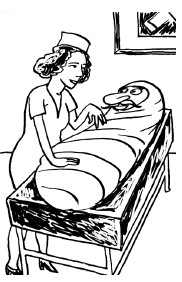 Мы заглядываем в разные процедурные кабинеты. В одном из них я вижу весьма странную фигуру. На кушетке лежит некто неопределенного пола, закутанный с головы до ног во что-то белое. Похоже на большой, в человеческий рост, кокон.