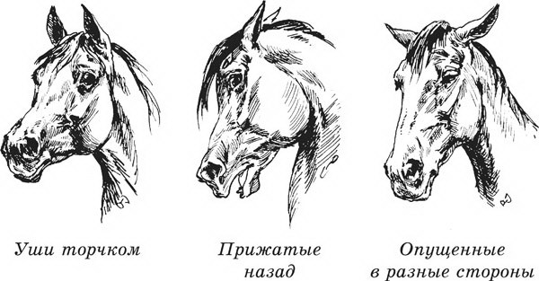 Наглядным индикатором настроения лошади являются посаженные на самом затылке острые уши, которые могут свободно поворачиваться в разные стороны. Уши торчком, направленные вперед, показывают внимание и желание пойти на контакт, а прижатые назад говорят: «Берегись! Ты мне не нравишься!» В таком гневном состоянии лошадь может отбить задними ногами или встать на дыбы. Если же уши слегка опущены в разные стороны, а глаза прикрыты, это означает, что животное просто задремало стоя.