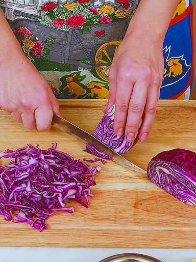Краснокочанную капусту промыть под проточной водой, затем нашинковать.