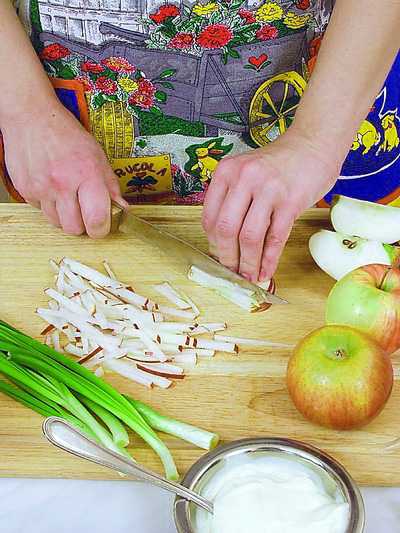 Красное яблоко, не очищая от кожицы, нарезать соломкой.