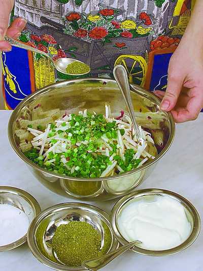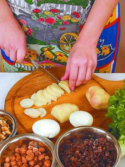1 клубень картофеля, 1 яйцо, 10–15 г грецких орехов, 10–15 г фундука (лесного ореха), 50 г изюма, 3 ст. ложки сметаны, листья салата, зелень петрушки и укропа, соль, перец черный молотый.