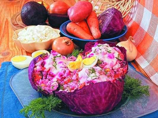 70 г краснокочанной капусты, 1 среднего размера клубень картофеля, 2 маринованных огурца, 2 яйца, 1/2 луковицы, 2 ст. ложки растительного масла, 1 ст. ложка лимонного сока, листья салата, зелень укропа, сахар, соль, пряности.