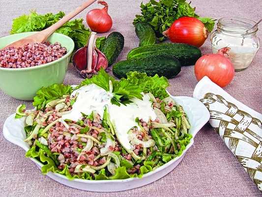 100 г гречневой крупы, 2 огурца, 20 г консервированного зеленого горошка, 2 зубчика чеснока, 1/2 луковицы, 2 ст. ложки майонеза, зелень сельдерея, листья салата, соль, перец черный молотый.