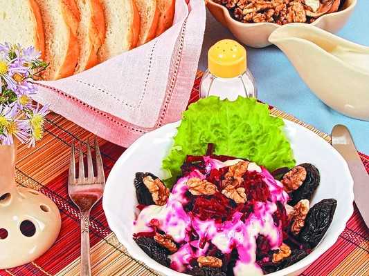 1 среднего размера свекла, 50 г чернослива без косточек, 30 г очищенных грецких орехов, 1 зубчик чеснока, 2 ст. ложки майонеза, листья салата.