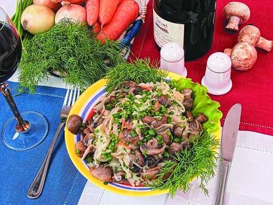 100 г квашеной капусты, 80 г маринованных грибов, 1/2 луковицы, 1/2 пучка зеленого лука, 2 ст. ложки растительного масла, зелень укропа, листья салата, сахар, соль.