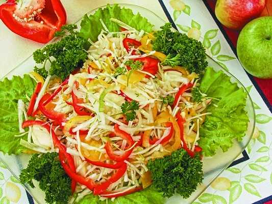 100 г белокочанной капусты, 1/2 желтого и 1/2 красного болгарского перца, 1 красное или зеленое яблоко, 1 луковица, 2 ст. ложки растительного масла, зелень укропа и петрушки, листья салата, соль.