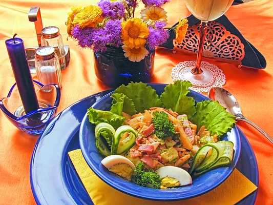 1 небольшой клубень картофеля, 60–80 г ветчины, 1 морковь, 1–2 свежих огурца, 1 яйцо, 1 ст. ложка майонеза, 1 ст. ложка томатного соуса, листья салата, зелень петрушки, соль, черный молотый перец.