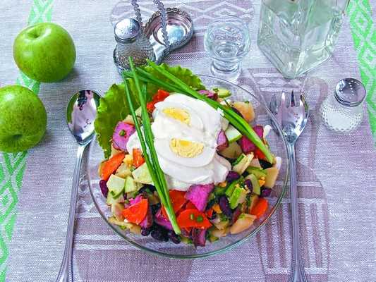 100 г говядины, 1 морковь, 1 клубень картофеля, 50 г консервированной красной фасоли, 2 яйца, 1 зеленое яблоко, 20 г сливочного масла, 2 ст. ложки сметаны, листья салата, зеленый лук, соль.