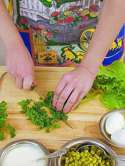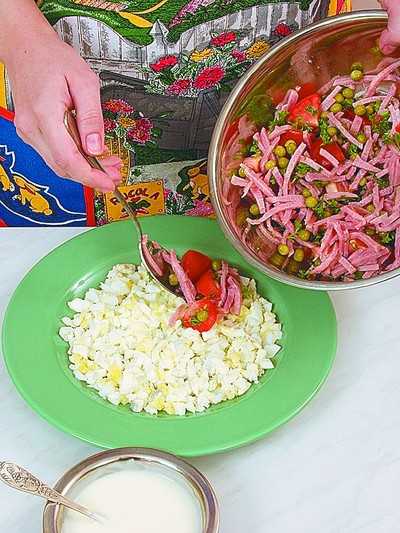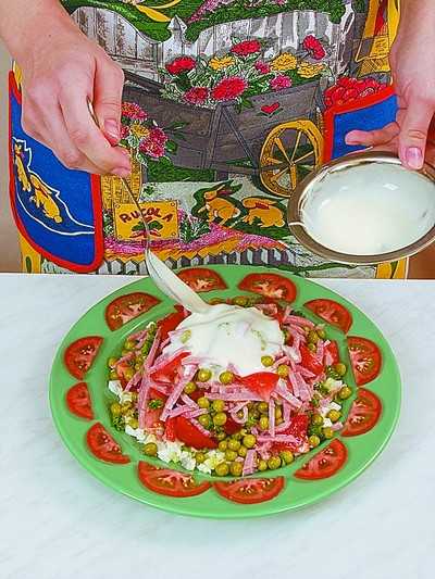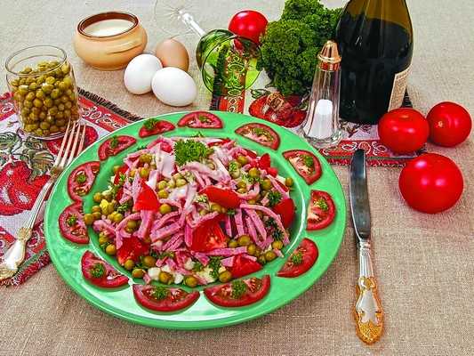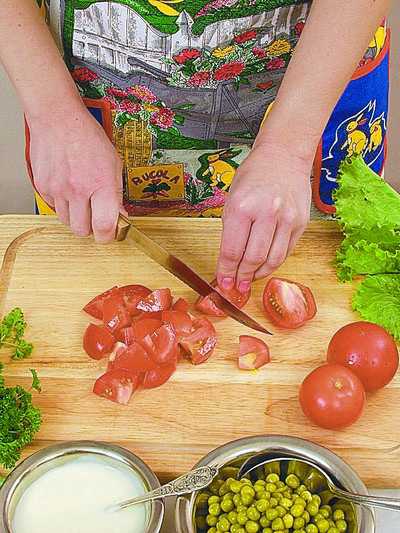 100 г ветчины, 1–2 помидора, 50 г консервированного зеленого горошка, 1 яйцо, 2 ст. ложки майонеза, зелень петрушки, соль, перец черный молотый.