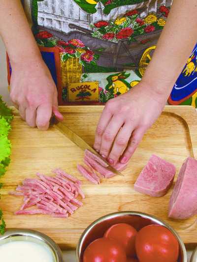 Ветчину из индейки не очень мелко нарезать соломкой.